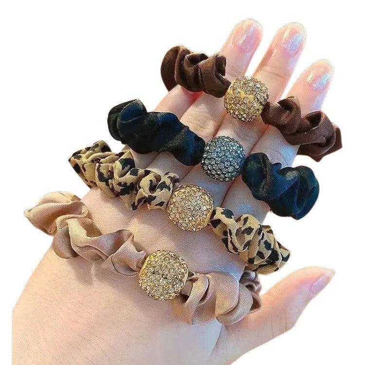 - Set van 4 scrunchies: zwart, beige, bruin en luipaardprint