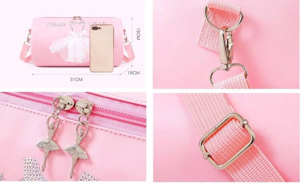 Deze betoverende sporttas is de ideale ballettas voor kleine danseresjes. Aan de voorzijde van de tas staat een prachtige ballerina jurk afgebeeld met echte tule.