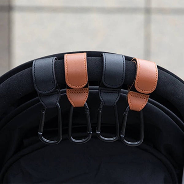 Dit setje bestaat uit 2 sterke universele buggy haakjes in de kleuren zwart en bruin. De riemen van de haakjes zijn gemaakt van duurzaam kunstleer met daaraan een karabijnhaak.