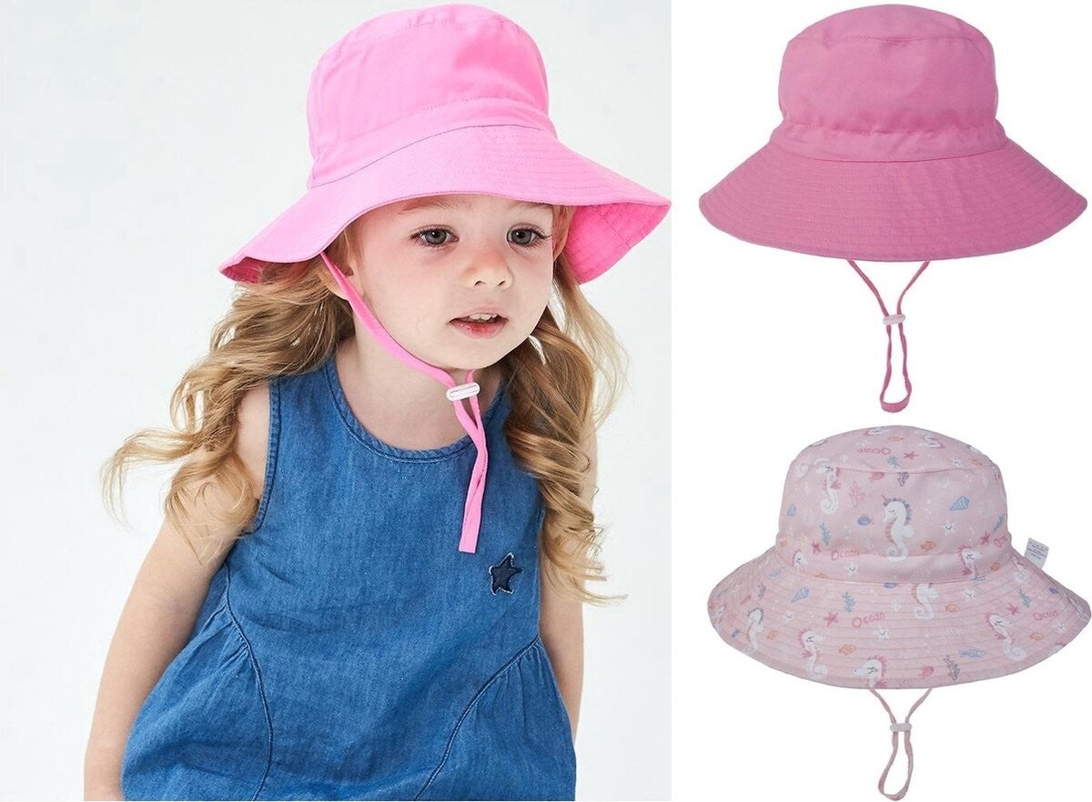 2 Stuks - Zonnehoedje Kind - Fuchsia Roze effen en Zeepaardjes - Maat 50 (6 t/m 24 mnd)