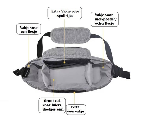 De organizer kan door middel van klittenband makkelijk bevestigd worden aan de kinderwagen/ buggy. Door de schouderriem die meegeleverd wordt kan de organizer ook als luiertas gebruikt worden.