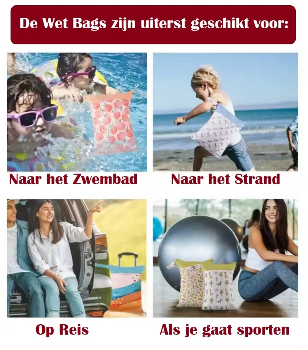Deze Wetbag is uiterst geschikt voor om natte kleding/ doekjes in op te bergen als je ergens naartoe gaat. Denk hier bijvoorbeeld aan het zwembad of strand. Je kan de natte kleding terugstoppen in de tas zonder dat al je andere spullen ook nat worden.