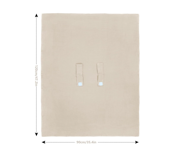 De doek kan door middel van klittenband vastgemaakt worden aan de hendel van de Maxi Cosi. Je kan de voorzijde eventueel een stukje omhoog rollen en vastzetten met knijpers.