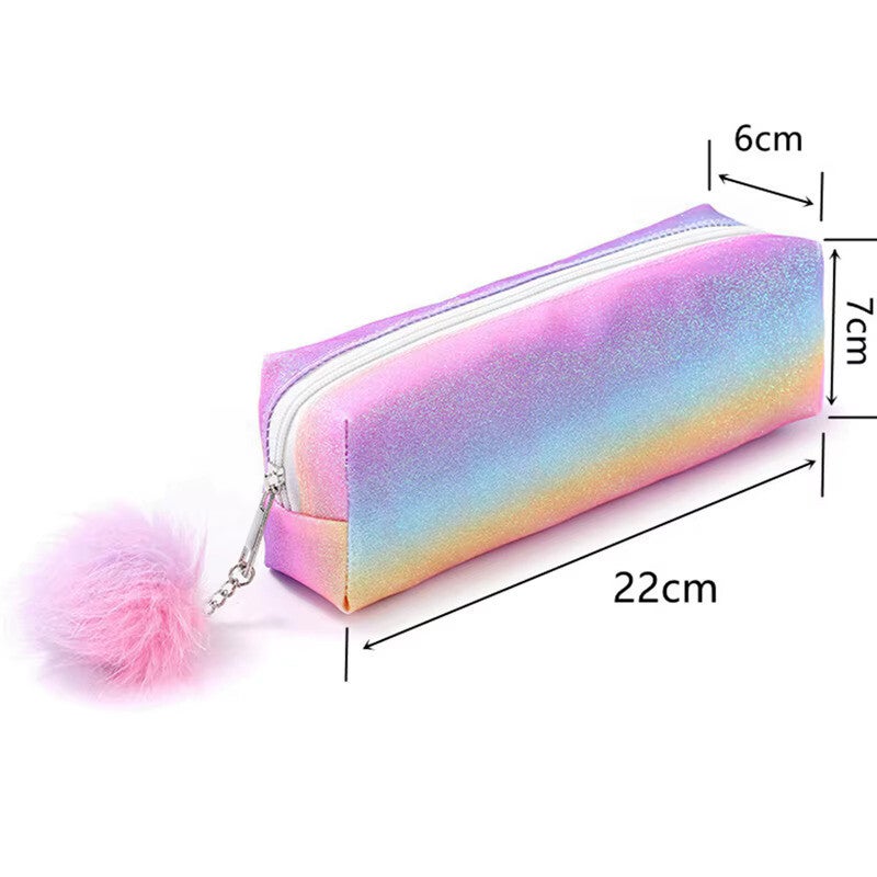 Deze glitter etui voor meisjes is niet alleen handig, maar ook een vrolijk en stijlvol accessoire voor school of thuis. De etui heeft een glanzende regenboogkleurige afwerking en een schattige pompom, waardoor hij extra speels en opvallend is.