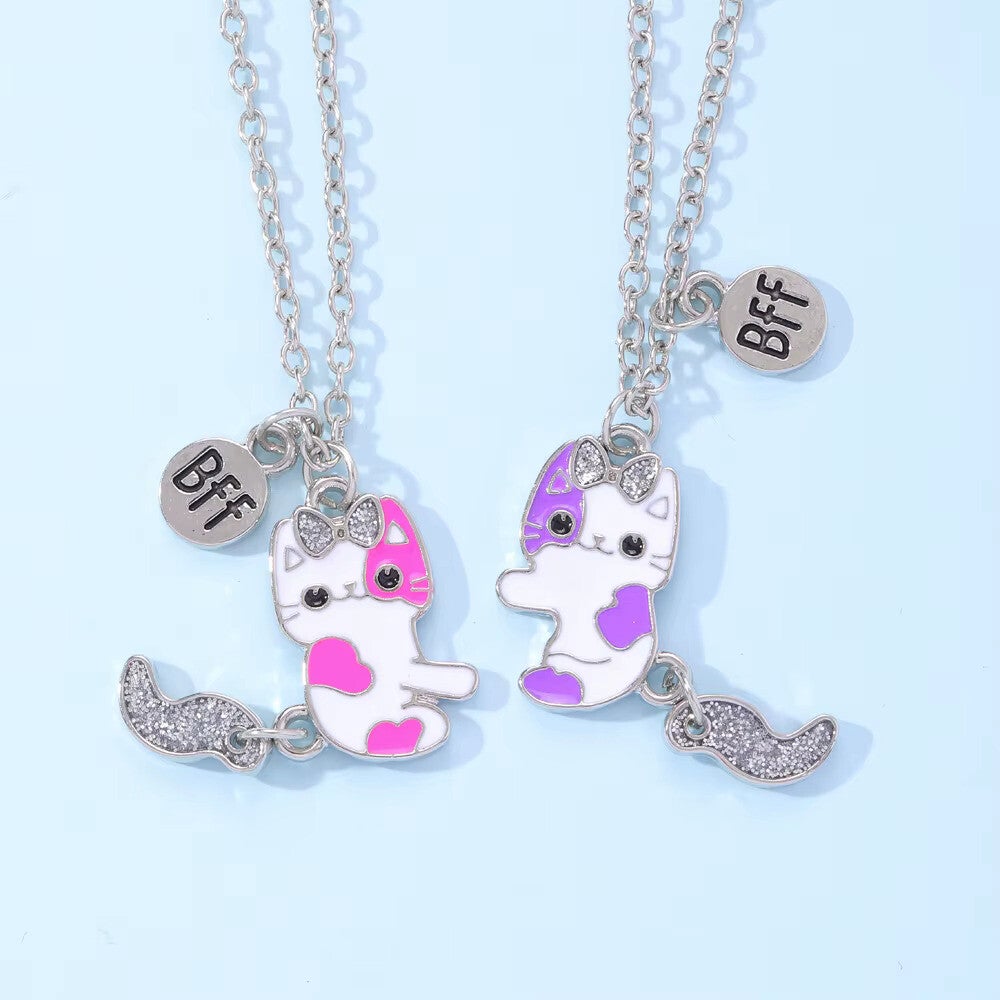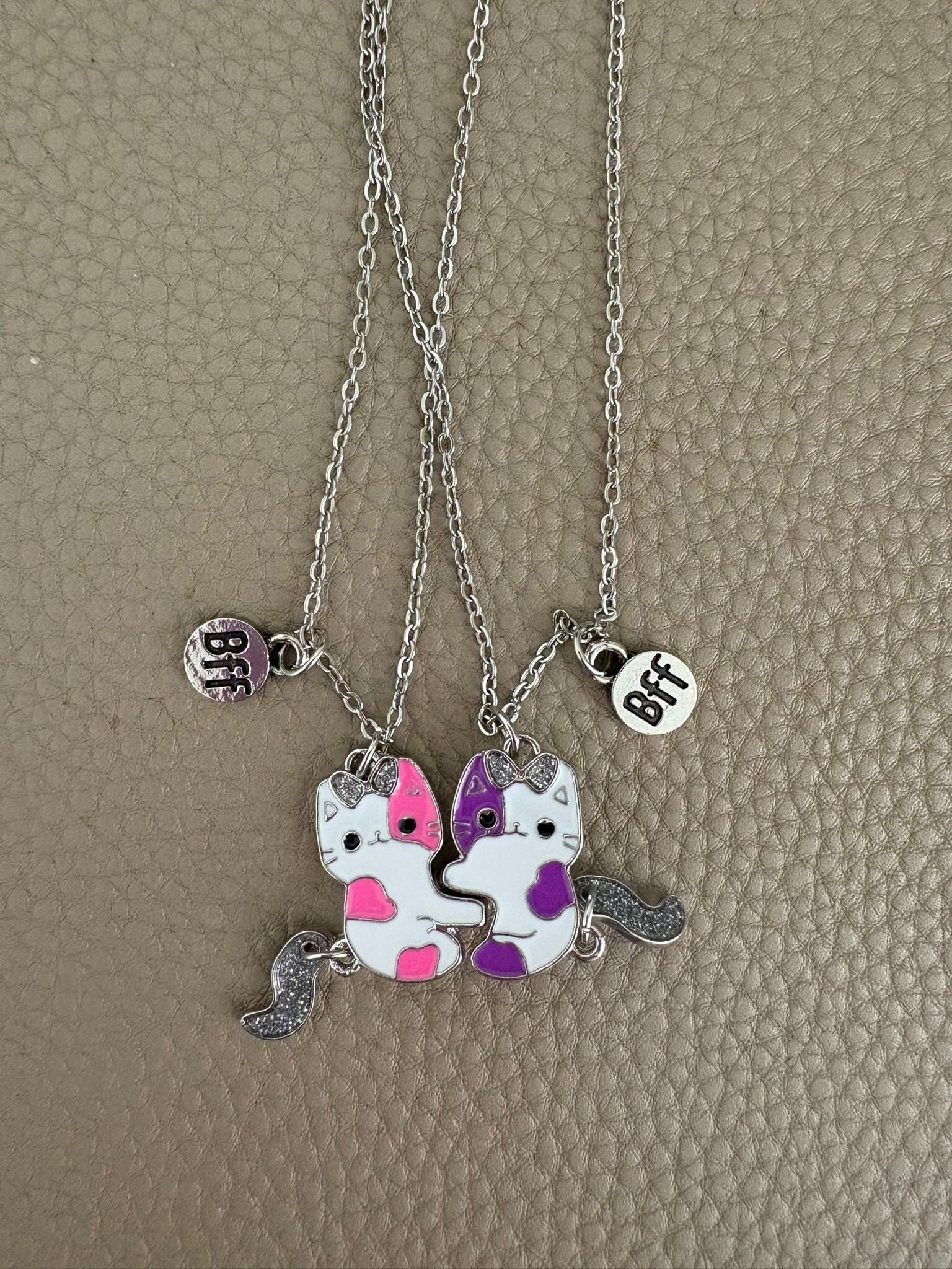 Het setje bestaat uit 2 kettingen: één ketting met een roze/wit poesje en de andere ketting een paars/wit poesje. Ze zijn enorm schattig en de poesjes blijven aan elkaar vast "geknuffeld" door middel van magneetjes. Aan elke ketting hangt een rond bff hangertje. Helemaal leuk toch!