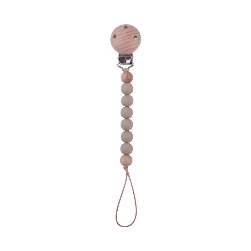 Dit setje bestaat uit twee prachtige speenkoorden gemaakt van siliconen kralen met een houten clip.