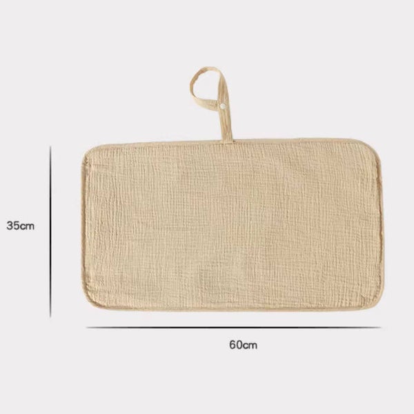 Dankzij het handige lusje met knoop rol je het matje eenvoudig op en klik je het vast. Zo blijft het compact en past het moeiteloos in elke luiertas. De warme beige kleur geeft een rustige, natuurlijke uitstraling die mooi past bij elke babyuitzet.