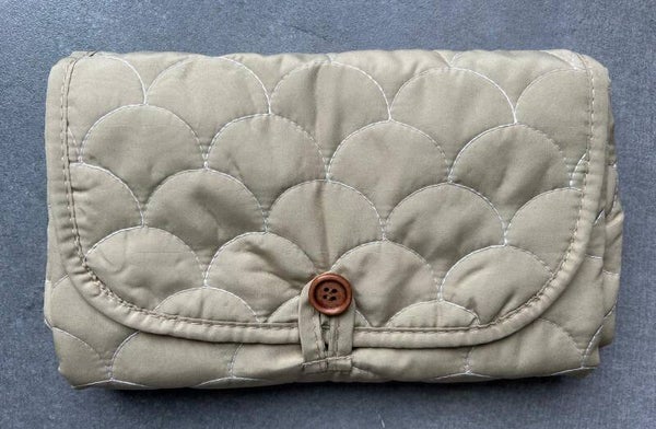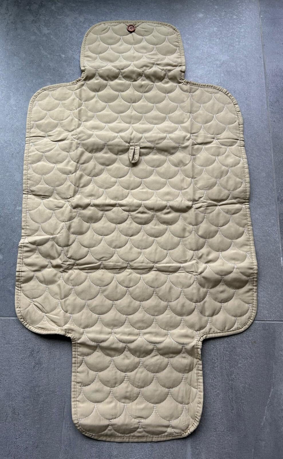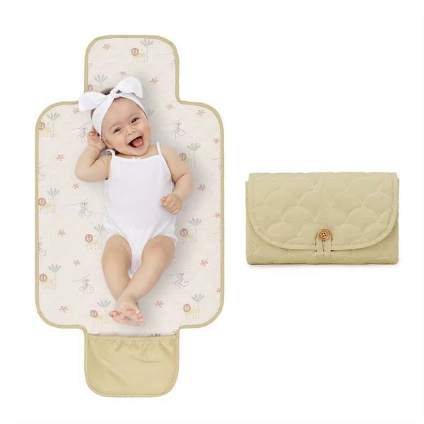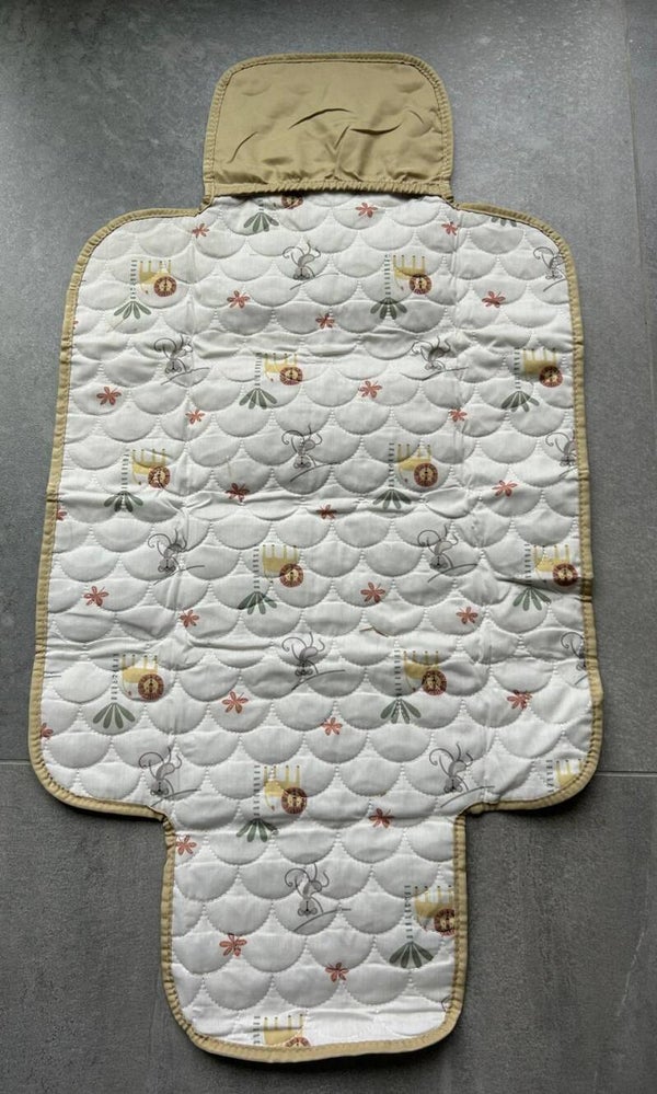 Het matje is licht van gewicht, opvouwbaar en eenvoudig mee te nemen in de luiertas. De buitenzijde is uitgevoerd in een rustige licht olijfgroene / groenbeige kleur met een elegant gewatteerd patroon. De binnenzijde heeft een zachte crème basis met een speelse jungleprint — met vrolijke aapjes, leeuwtjes en kleine plantjes.