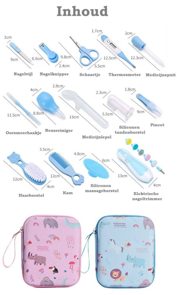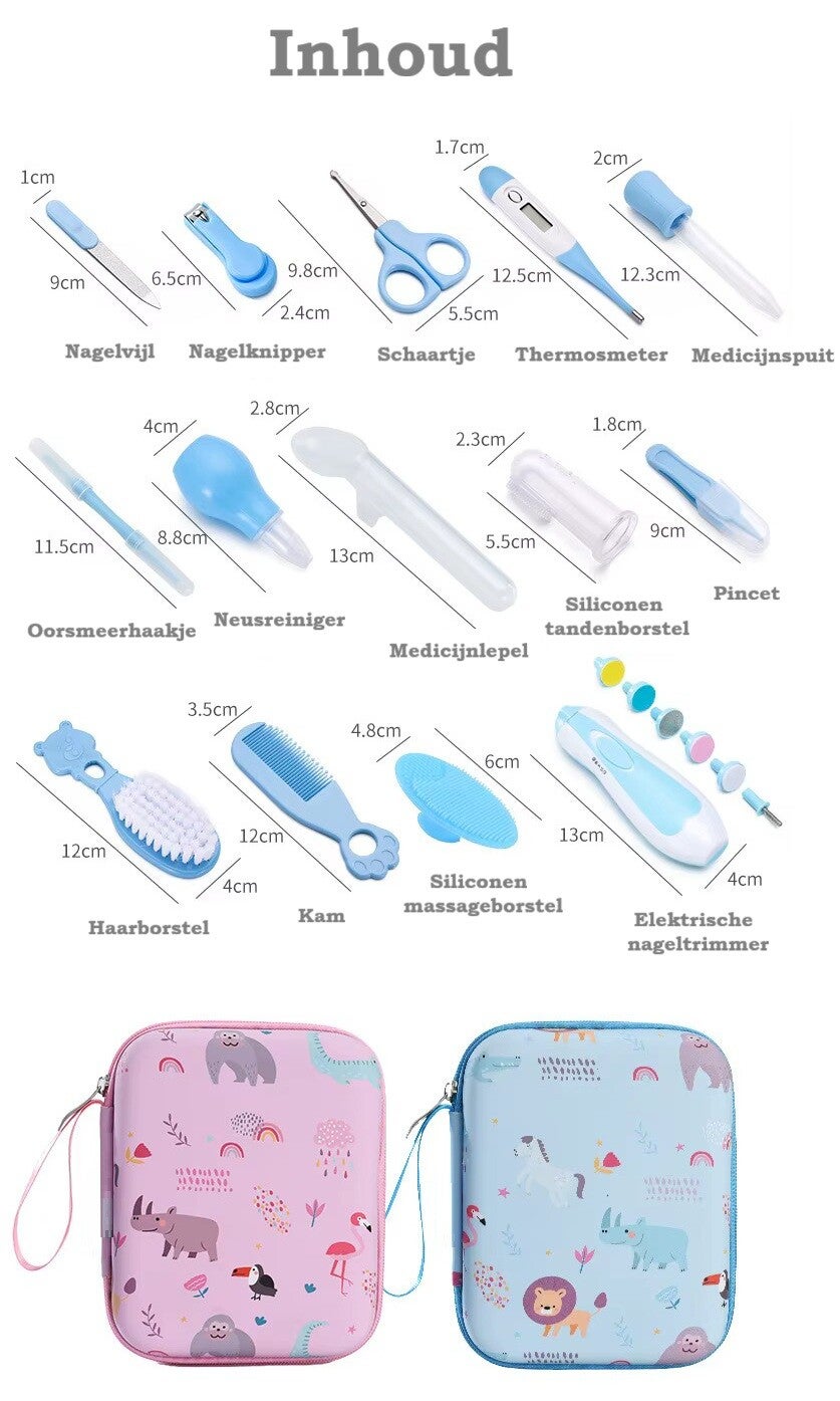 Perfect voor pasgeborenen en jonge baby’s, deze set bevat alles wat je nodig hebt voor nagelverzorging, hygiëne, medicijntoevoer en mondverzorging: