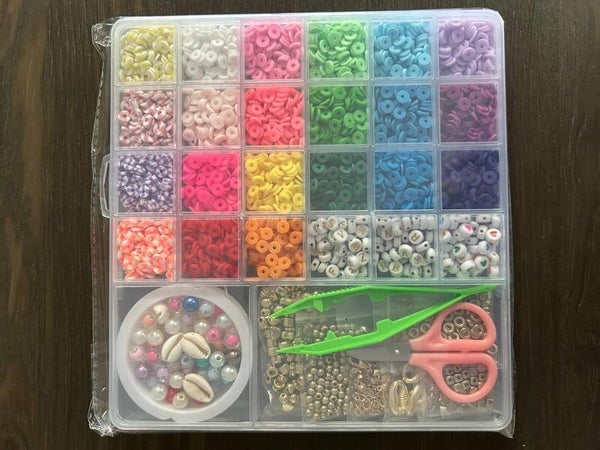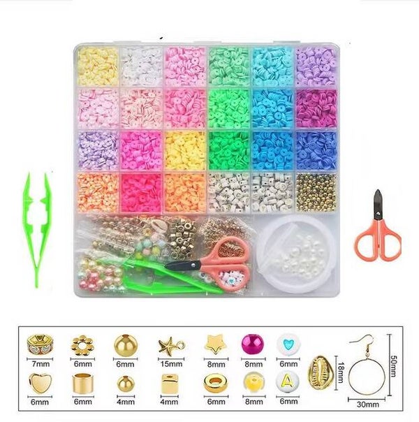 Deze kleurrijke set bevat polymeer klei kralen in 24 prachtige kleuren, samen met letterkralen, gouden bedels, schelpen en elastisch draad – alles wat je nodig hebt om zelf de mooiste armbanden, kettingen of enkelbandjes te ontwerpen.