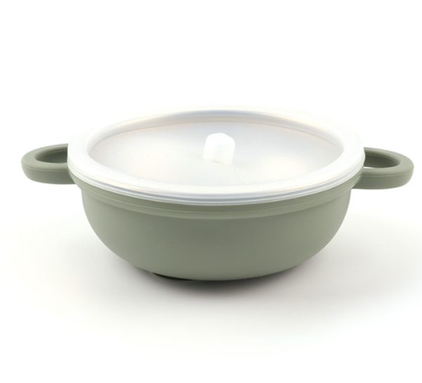 Siliconen babykom met handvaten - RVS binnenkom - deksel en Houten bestek – Groen
