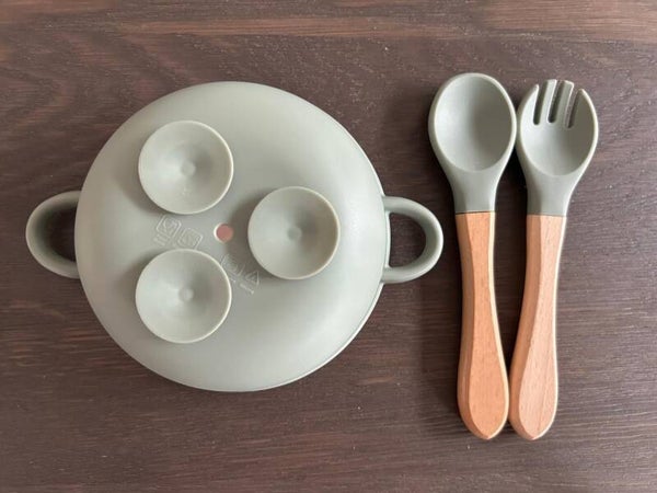 De set wordt geleverd met een lepel en vork met een houten handvat en siliconen uiteinde, perfect afgestemd op kleine kinderhandjes.