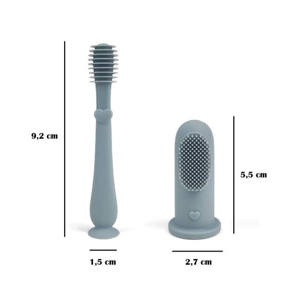 Leer je kindje spelenderwijs poetsen met deze 2-delige silicone baby tandenborstelset in een stijlvolle blauwe kleur.