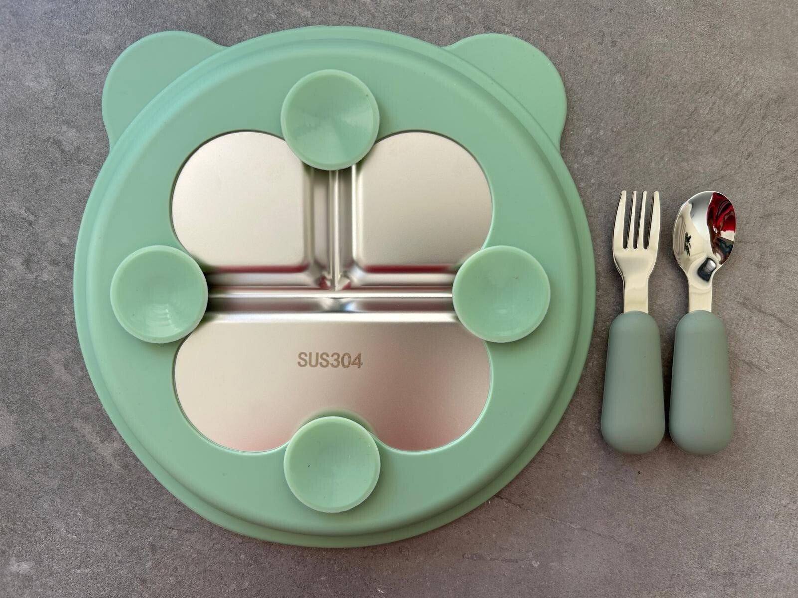 De bijgeleverde RVS lepel en vork met siliconen handgrepen zijn speciaal ontworpen voor kleine kinderhandjes – comfortabel, veilig en makkelijk vast te houden.