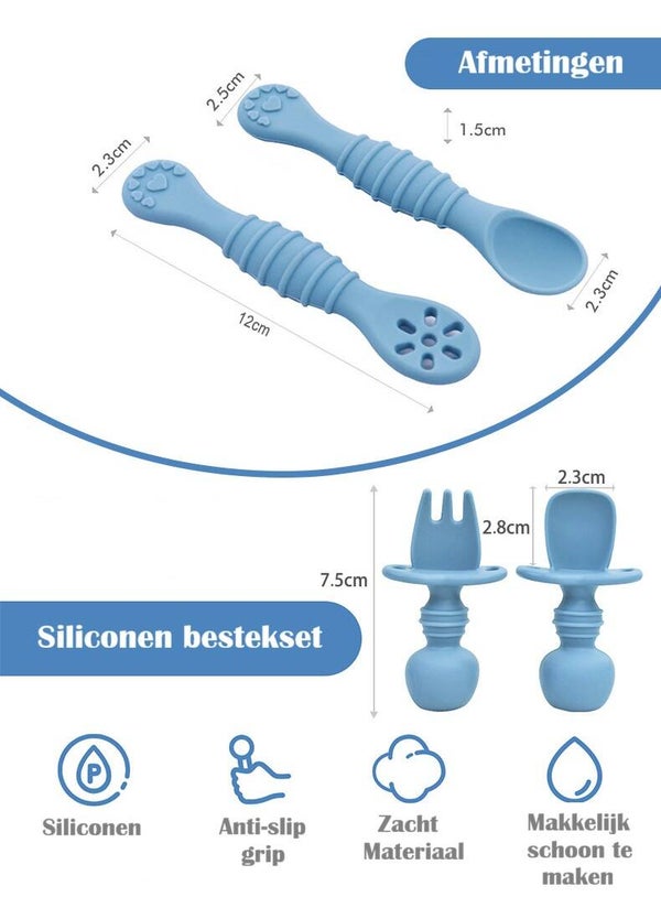 Deze siliconen baby bestekset in een zachte crème kleur is speciaal ontworpen om je kindje veilig en zelfstandig te leren eten. De set bestaat uit 2 complete besteksetjes (groot en klein), perfect afgestemd op verschillende ontwikkelingsfases.