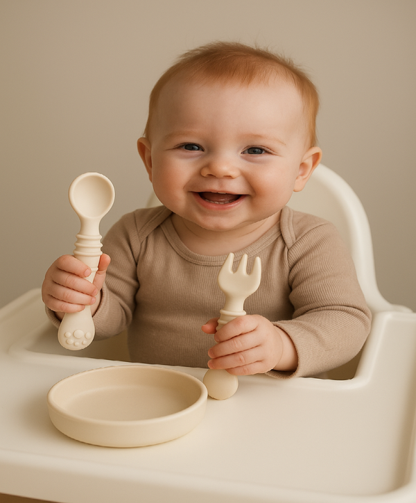 Siliconen Baby Bestekset – 2 Sets (Groot & Klein) – Ergonomische Greep – BPA-vrij – Crème – Vanaf 6 Maanden