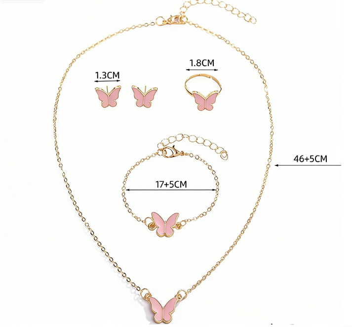 Deze prachtige meisjes sieradenset met vlinderdesign is perfect voor jonge sieradenliefhebbers. De 4-delige set bestaat uit een ring, oorbellen, ketting en armband, allemaal stijlvol uitgevoerd in een goudkleurige afwerking met zachte roze details. Het speelse maar elegante ontwerp maakt deze set geschikt voor zowel dagelijks gebruik als feestelijke gelegenheden.