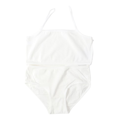 Deze comfortabele meisjes ondergoed set in wit en blauw is ideaal voor dagelijks gebruik. De set bestaat uit een katoenen hemdje met spaghettibandjes en een bijpassende slip, speciaal ontworpen voor meisjes van 9 tot 11 jaar.