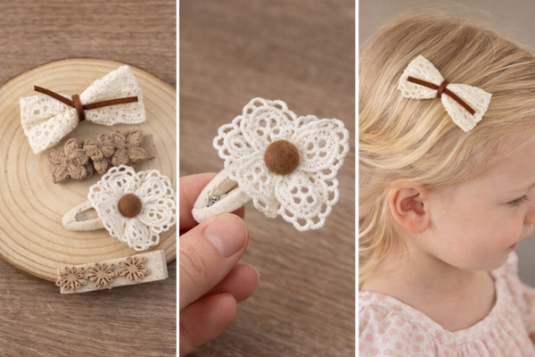 Deze schattige set van 4 haarclipjes voor meisjes is perfect voor kleine fashionista’s die houden van een zachte, romantische uitstraling. De haarclipjes zijn uitgevoerd in beige en crème tinten en versierd met kant, stoffen bloemetjes en een lieve strik.