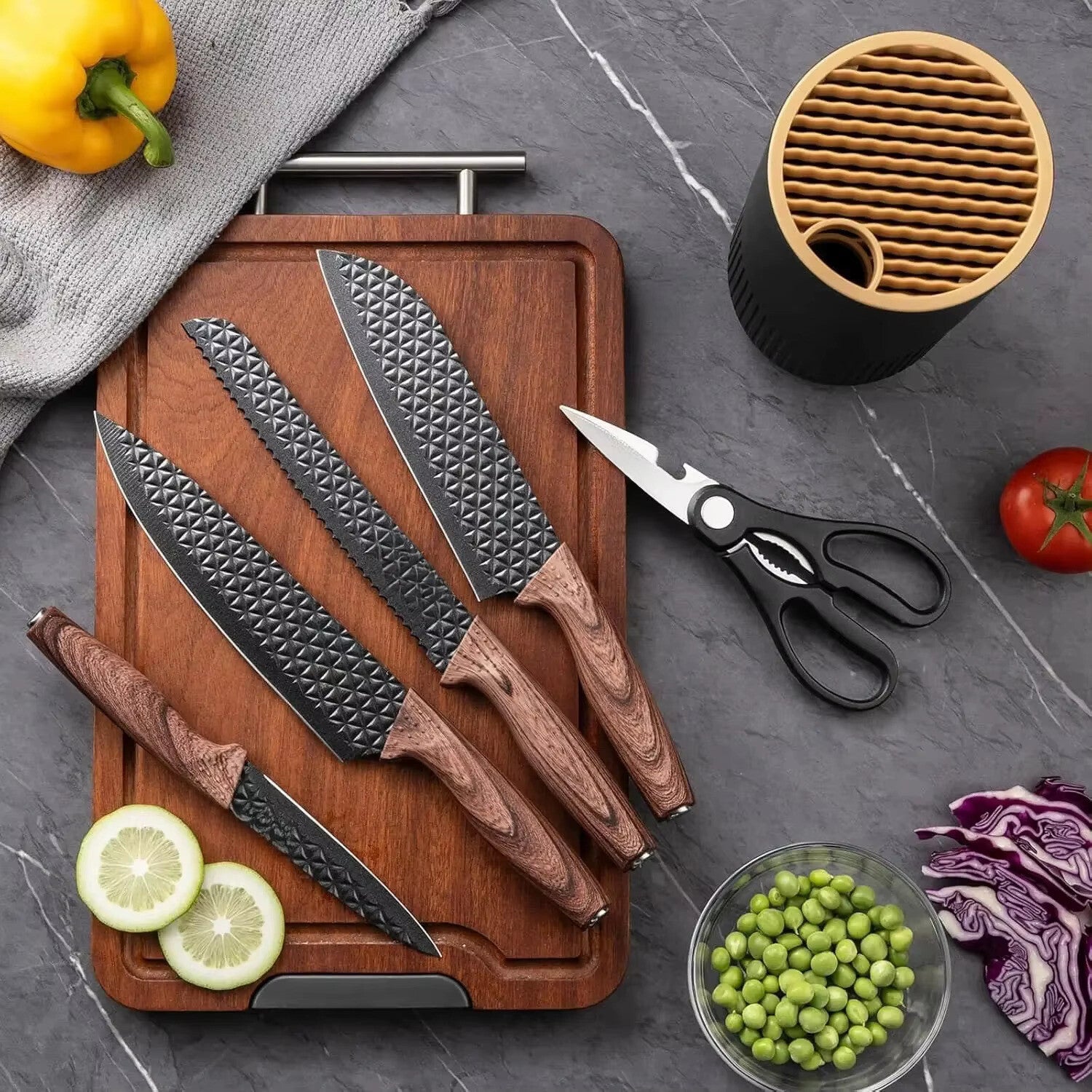 Met deze moderne messenset met houder haal je niet alleen kwaliteit en gebruiksgemak in huis, maar ook een stijlvolle blikvanger die perfect past in iedere keuken.