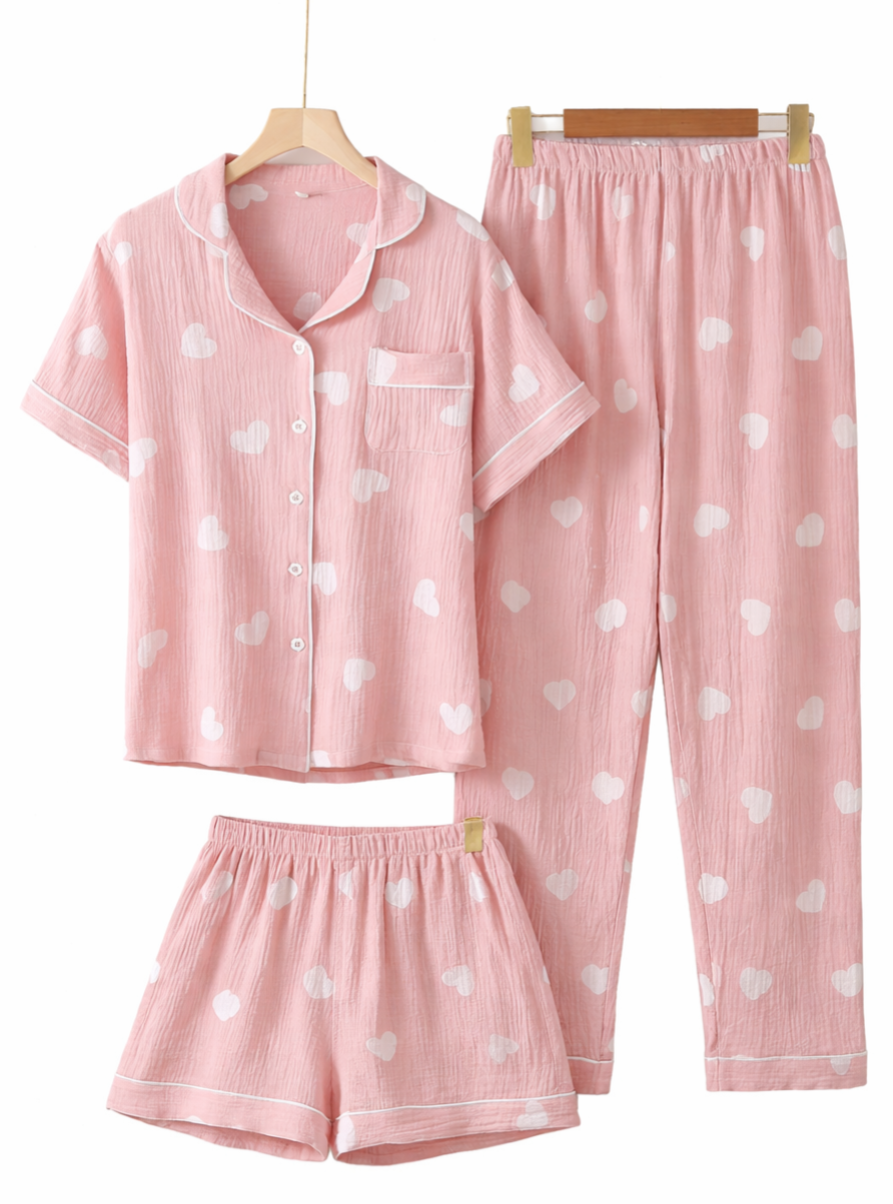 Dames Pyjama Set Katoen – Roze Hartjes – 3-delig (Lange Broek & Korte Broek) – Hydrofiel Katoen – Maat L (valt als M)