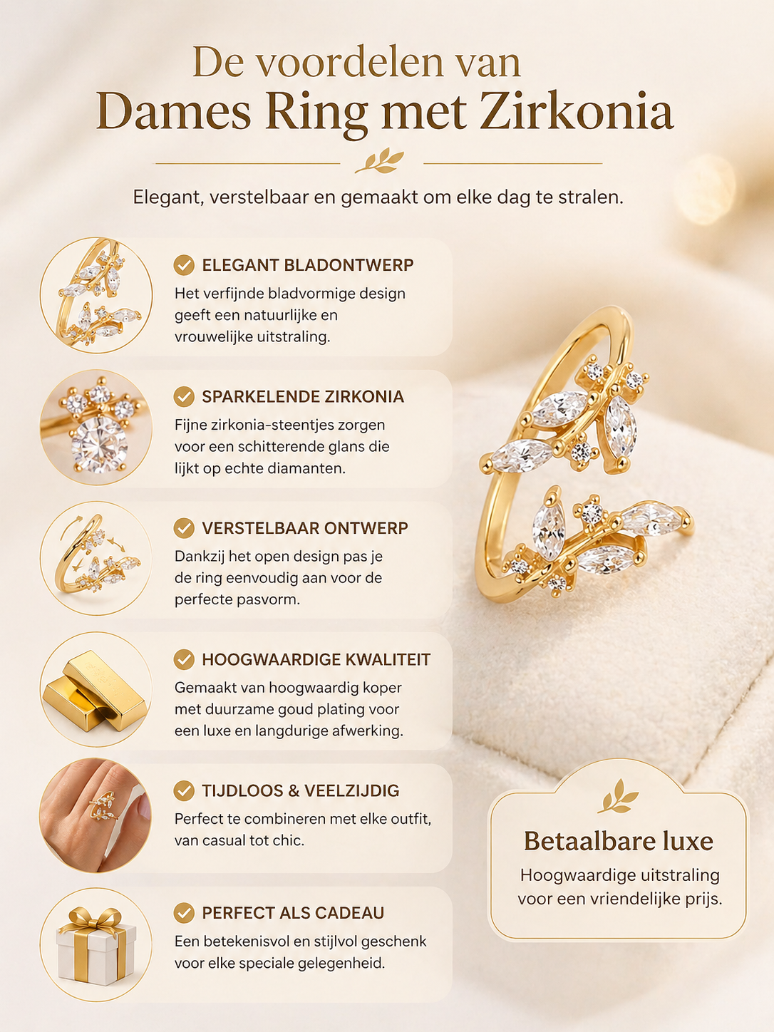 Deze stijlvolle dames ring goudkleurig is een echte eyecatcher dankzij het verfijnde bladvormige design en de sprankelende zirkonia steentjes. De combinatie van een luxe uitstraling en een subtiel ontwerp maakt deze ring dames verstelbaar perfect voor zowel dagelijks gebruik als speciale gelegenheden.