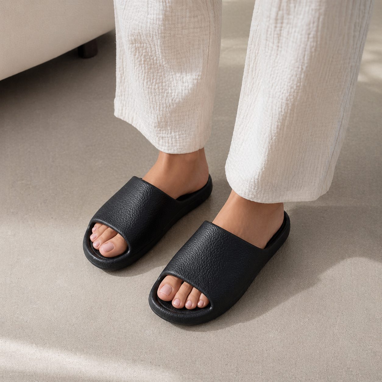 De neutrale zwarte kleur maakt ze geschikt voor zowel dames als heren. Perfect als huisslippers, badslippers of douche slippers – stijlvol, comfortabel en praktisch in één.