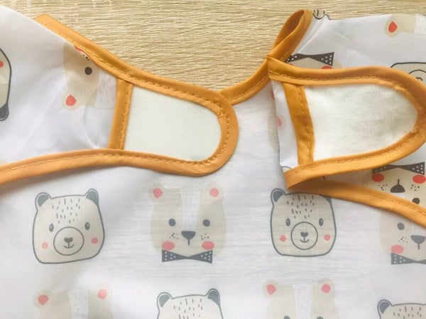 Dit slabbetje met lange mouwen in vrolijk oranje met beerprint beschermt de kleding van je kindje tegen etensvlekken en etensresten. Het slabbetje is voorzien van een brede opvangbak, zodat kruimels en vloeistoffen veilig worden opgevangen.